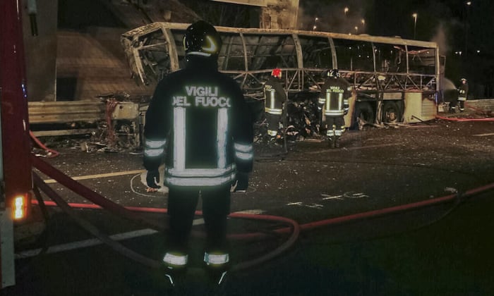 Others were trapped inside the bus when it caught fire, Ansa said. Ten of those in hospital are seriously hurt, it said.